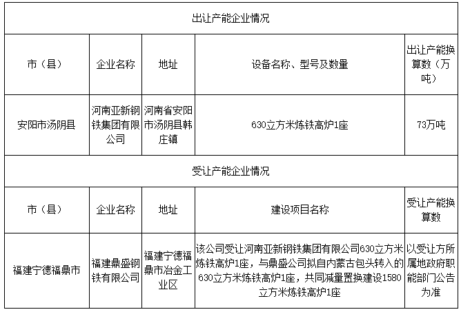 按照《国务院关于化解产能严重过剩矛盾的指导意见》(国发〔2013〕41号)、《工业和信息化部关于印发钢铁水泥玻璃行业产能置换实施办法的通知》(工信部原〔2017〕337号)要求,安阳市工业和信息化局于2019年12月6日至2019年12月13日对河南亚新钢铁集团有限公司1座630立方米炼铁高炉产能出让情况进行了公示,公示期未收到任何异议。现将河南亚新钢铁集团有限公司产能出让情况予以公告,欢迎社会公众进行监督。