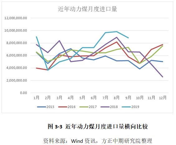 2018年我国煤炭进口量在上半年涨势惊人,由于国外价格跌幅较大,内外价差优势明显,进口量不断攀升。另一方面国家进口煤政策的变化也使得全年煤炭进口呈现前松后紧的趋势。进入2019年,煤炭进口形势可谓是非常之好。去除2月份假日因素影响外,今年前9个月同比增长达到9.5个百分点,5月单月的量同比增幅甚至达到了34.7%。这样的数据对于年初“平控”的总基调来讲是非常危险的,未来几个月一旦政策收紧,进口量可能出现断崖式下跌。因此,明年年初,尤其是1月将是进口煤抢通关的重要时点。综合全年来看,进口煤由于价差巨大另外沿海电厂依存度较高,2020年依然将呈现增长态势,但也要随时关注政策的变化情况。