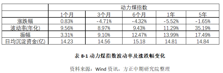 从动力煤的波动率情况来看,呈现出明显的波动率下降趋势,越是近几年波动率约有所收窄。近一年的年度涨跌幅仅为百分之五左右。从中期维度来看,动力煤从2017年以来波动幅度就越发收窄,但是从上市之初到2016年底这三年多的时间来看,动力煤的波动幅度还是相当可观的,甚至能出现2016年,年度上涨65%的大型趋势性行情。