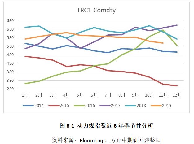 总体来看,动力煤价格走势季节性规律不强,尤其是在15年以及16年。由于价格全年范畴的下行和上行区间使得季节性特点更是进一步削弱。抛开这两年不谈,从动力煤上市以来的其他年份我们可以依稀看出,动力煤的淡旺季特点。每年“迎峰度夏”以及“冬储”是动力煤旺季行情的启动时点,也就是4-5月以及9-10月,届时动力煤在没有其他因素的影响下,一般会呈现季节性走强的趋势。