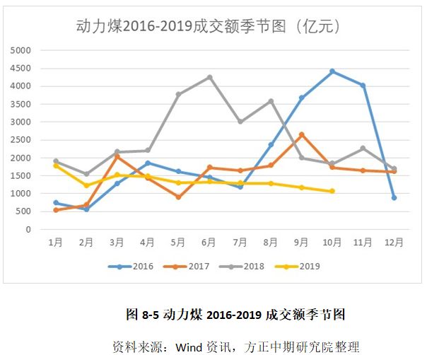 动力煤合约在结束了2016的单边上涨行情后,已经连续两年延续震荡行情。2017年时盘面整体震荡抬升,2018年则是震荡偏弱的走势。全年阶段性的分成了两波上涨和三波下跌行情。进入2019年后,盘面波动幅度进一步收窄,整体上维持1-4月震荡走强,之后震荡走弱的趋势。