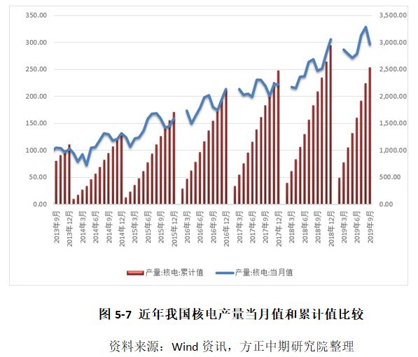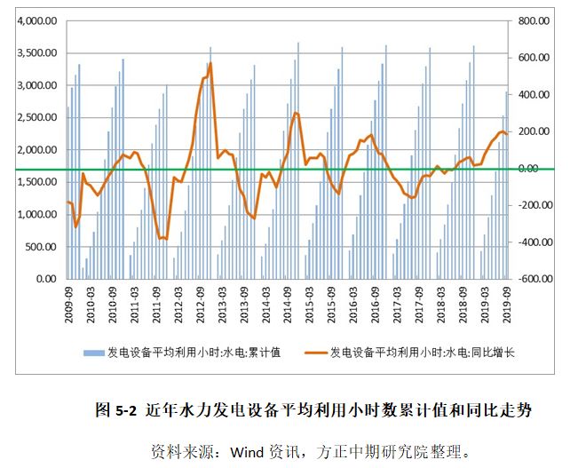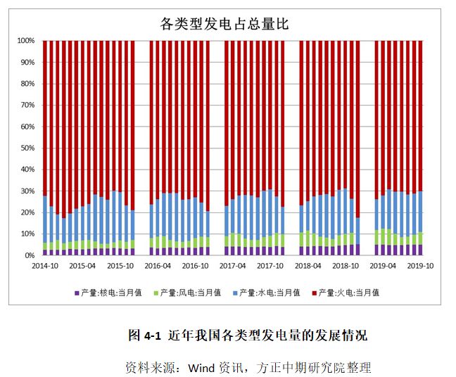 水电在2019年可谓是尤为耀眼。从水力发电的新增设备容量变化中我们可以看到,近两年来水电新增装机是在同比下降的,但是今年发电设备平均利用小时数却在同比增长。究其原因,首先是因为自然条件所带来的天时——今年降水量充足,是个难得的丰水年;另外也是由于我国对于可再生能源发展的政策导向。国家《能源发展“十三五”规划》中我国能源消费结构调整的重点就是非化石能源替代化石能源,到2020年我国煤炭消费比重应降至58%。在这一大背景下,新能源如风电、光伏还有核电在飞速发展,火电则在逐步后退让位于新能源和水电。