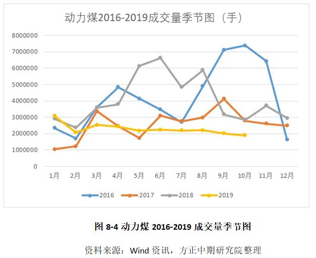 从资金变化情况来看,动力煤品种资金沉淀的增长是缓慢而持续的。从2015年底开始,不管是持仓量还是成交量就开始持续上涨。到了2016年动力煤单边大趋势上涨的年份,其成交量也达到了一个顶峰,此后持仓量一直保持着较高水平,但是成交量基本是与上涨行情的出现呈正相关的。这也说明国内期货交易者的特点:买涨不买跌,在股票市场交易规则的长期影响下,期货市场也呈现出上涨趋势中资金大量涌入的特点。