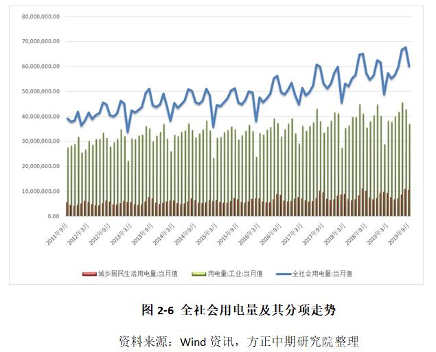 1-9月,全社会用电量累计53442亿千瓦时,同比增长4.4%。分产业看,第一产业用电量581亿千瓦时,同比增长4.7%;第二产业用电量35857亿千瓦时,同比增长3.0%;第三产业用电量8994亿千瓦时,同比增长8.7%;城乡居民生活用电量8010亿千瓦时,同比增长6.3%。2019年的用电量增长保持增长但是增速较2018年有所放缓,