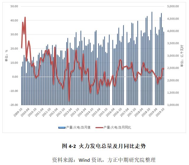2019年我国发电量保持增长,只是增速有所放缓,其中火电更是一度呈现负增长。根据国家统计局最新数据显示,10月份,全国发电量5714亿千瓦时,同比增长4.0%。其中,火力发电量3969亿千瓦时,同比增长5.9%;水力发电量1074亿千瓦时,同比增长-4.1%;核能发电量288亿千瓦时,同比增长5.4%;风力发电量286亿千瓦时,同比增长10.0%;太阳能发电量97亿千瓦时,同比增长3.0%。