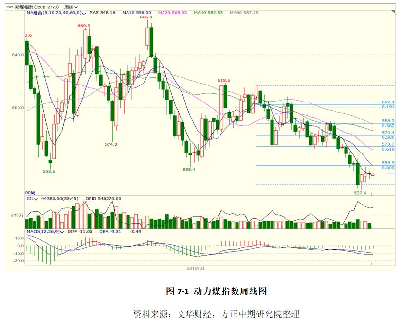 抛开基本面的诱因不说,技术面走势是非常规整的有顶有底的区间震荡。目前动力煤依然处于下行趋势中,预计2020年上半年也将会呈现先抑后扬的走势,低点在500附近,反弹第一目标价位590。下半年走势将重心再度下移,全年震荡偏弱,主要运行区间500-600。