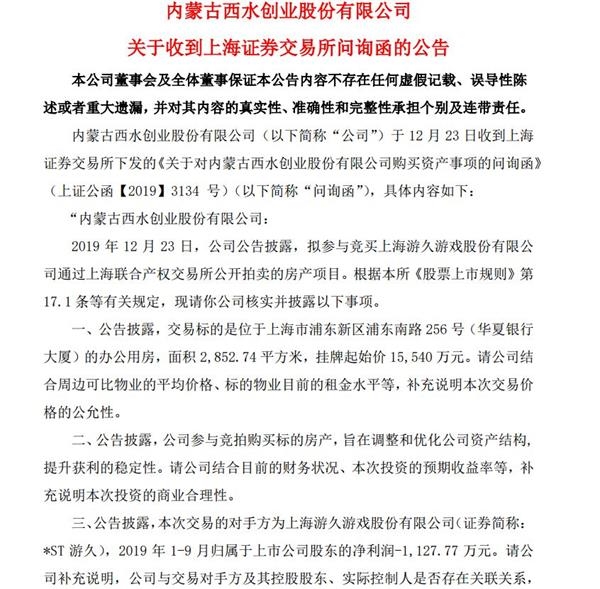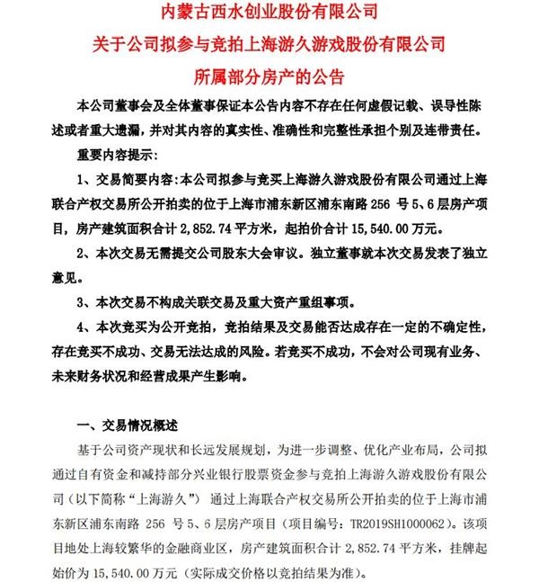 12月23日,A股上市公司内蒙古西水创业股份有限公司西水股份公告表示,拟参与竞买上海游久游戏股份有限公司拍卖的房产项目,起拍价1.554亿元。