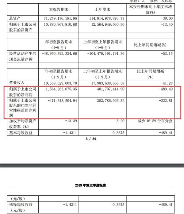 三季报显示,截至今年9月30日,公司实现营业收入105.6亿元,同比下滑41.28%;归属于上市公司股东的净利润-15.64亿元,较上年同期由盈转亏,同比下滑489.40%。