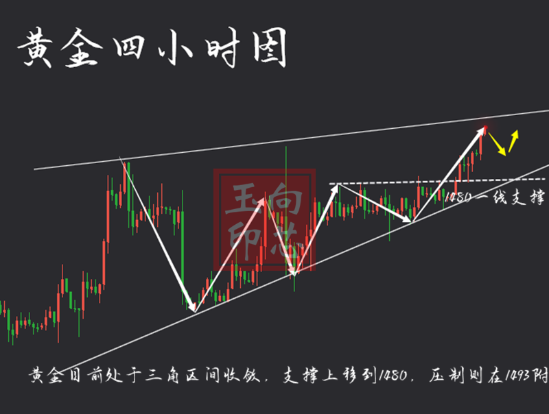 短线图:4小时小台阶整理上扬。连续的下探回升蓄势突破,而突破口1480-1481转换成支撑,昨日尾盘回踩确认再摸高,今日依托突破后1480做支撑继续顺势看短线多,目标暂定1490-1492一带。