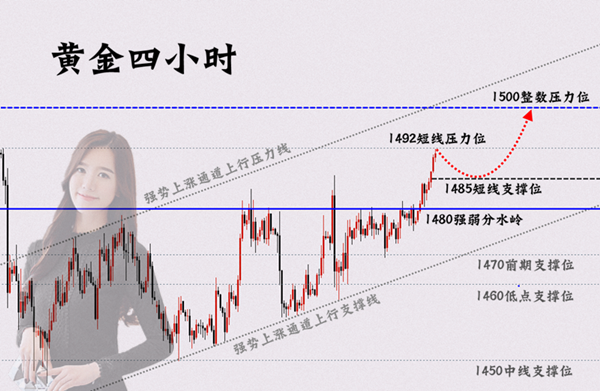黄金行情分析:日线黄金分割线技术图,今日受到市场唱衰美元影响,金价抬头走高,盘中成功上破技术线0.236(1487.8美元/盎司)压力,上探至1492美元附近。但是考虑到日内金价受假期与市场情绪影响,金价的上行多头走势还是值得我们深入考究的。今日晚间美盘重点关注技术线0.236(1487.8美元/盎司)支撑,若金价能站稳此支撑则待假期过后金价有望震荡上攻至千五关口;反之,金价则有延续震荡的趋势。