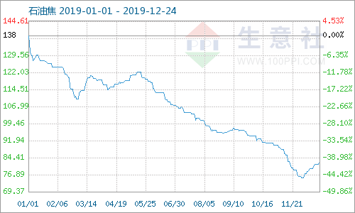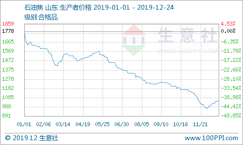 2019年地炼石油焦市场价格走势持续下跌,据生意社监测数据显示,国内地炼厂家石油焦产品主流均价年初为1778.60元/吨,截止到12月24日为1055.75元/吨,价格整体下跌40.64%。