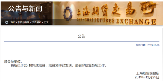 新浪财经讯 12月25日,上期所公告称,已于20:18完成结算,结算文件已发送。请做好结算各项工作。