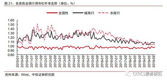 商业银行内部的杠杆率同样有明显分化。截至2019年10月,全国性商业银行、城商行、农商行的债市杠杆率分别为0.98、1.08和1.04,较上月分别变动+0.01、+0.01、持平。从相对位置来看,目前城商行和农商行的债市杠杆率分别处于12%和3%的历史分位数,继续降杠杆的空间已经不大。