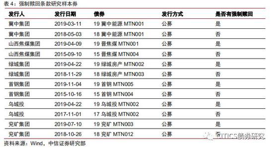 强制赎回条款对新老券利差的影响在2~23bps,规律性并不明显。截至2019年12月18日,样本中6个主体的新老券利差分化明显,由高至低依次为首钢集团、冀中集团、山西焦煤集团、绿城集团、兖矿集团和乌城投,高至22.5bps,低至1.9bps。无论从企业性质还是外部评级来看,强制赎回条款导致的新老券利差分化并无显著规律,但可能与发债主体的再融资难度呈一定的相关性。一般来说,再融资难度较大的主体不会轻易对存续债券提前赎回,因此强制赎回条款被触发的概率更低,导致其新老券利差也相应更低。
