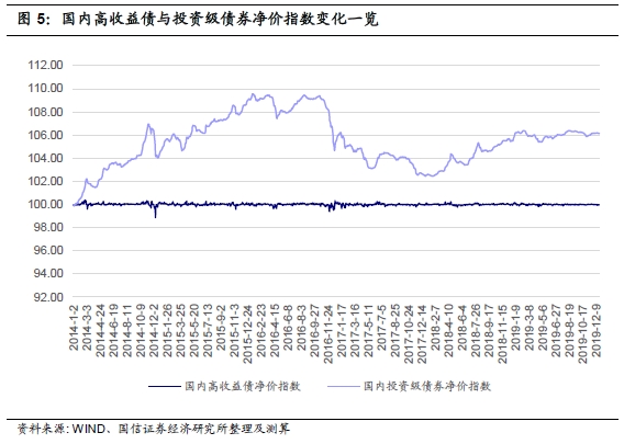 从国内高收益债净价指数与国内投资级债券净价指数比较来看,投资级债券净价指数波动很大,最高接近110,且全部在100以上;而整体高收益债净价指数基本维持在100附近不变。