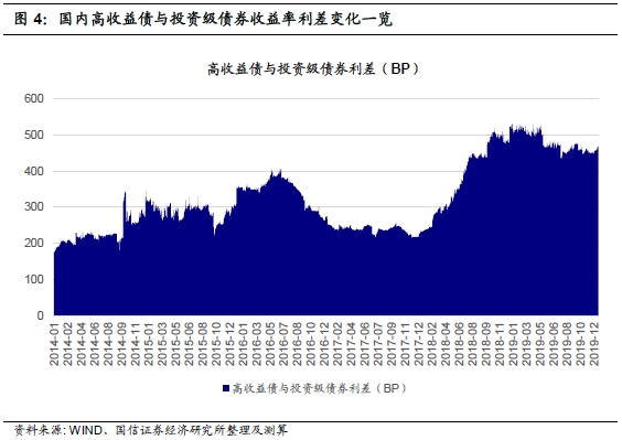 2019年三季度起,国内高收益债余额又开始回升。截至2019年12月20日,国内高收益债余额约为1.6万亿元。