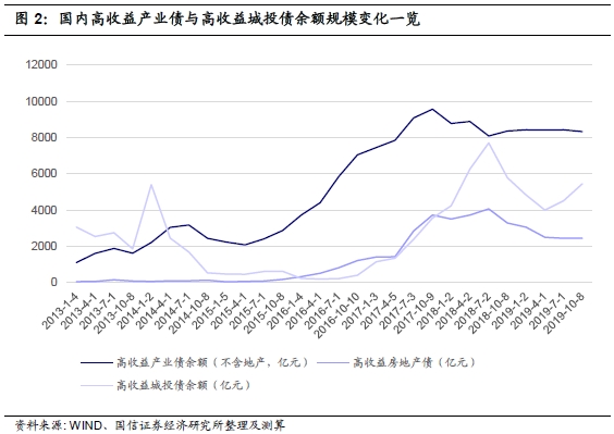 截至2019年12月20日,国内高收益产业债规模约为0.8万亿元,高收益房地产债规模约为0.3万亿元,高收益城投债规模约为0.5万亿元。