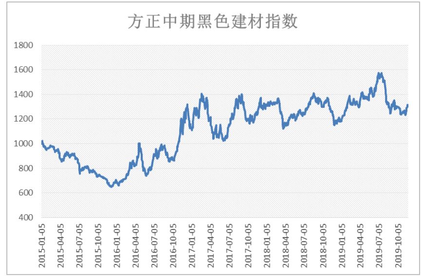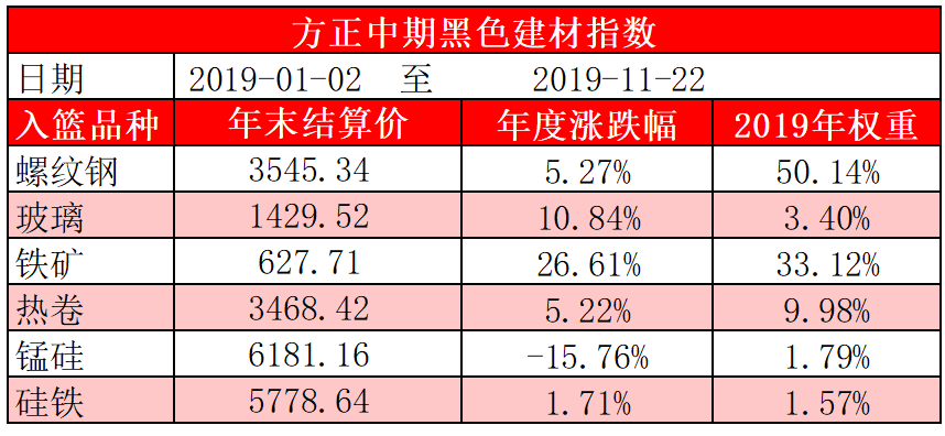 2019年方正中期黑色建材指数先扬后抑,1月2日开于1185.27,11月22日收于1315.38,上涨130.11,涨幅10.98%,指数均值为1354.69,高点为1575.35,低点为1185.27。所包含的6个活跃品种大多上涨,其中有5个上涨,1个下跌。其中表现最好的是铁矿期货上涨26.61%,表现最差的是锰硅下跌15.76%;