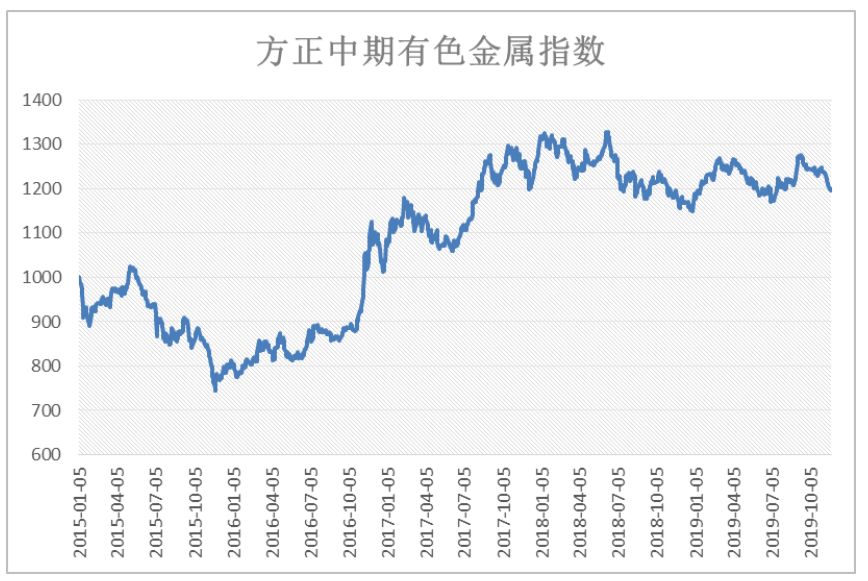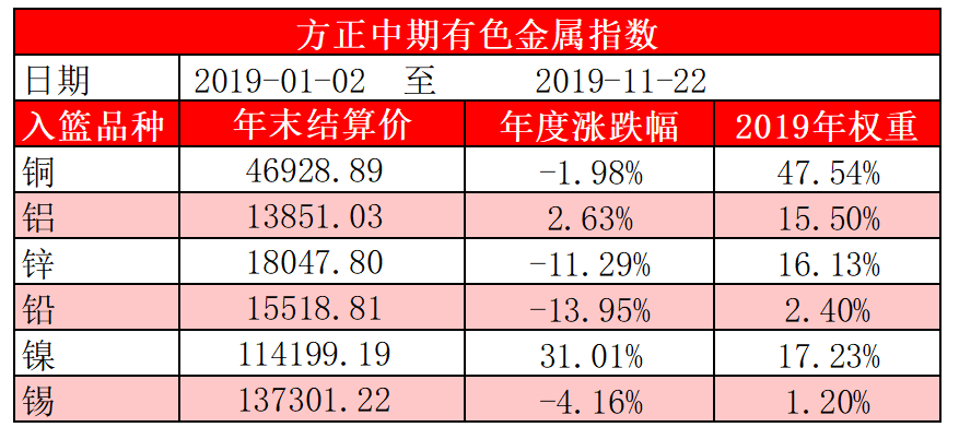 2019年方正中期有色金属指数先扬后抑再扬后抑,整体呈现出“M”型走势。1月2日开于1189.15,11月22日收于1196.45上涨7.3,涨幅0.61%,指数均值为1123.78,高点为1275.46,低点为1169.10。所包含的6个活跃品种中2个上涨,4个下跌。其中表现最好的是镍上涨31.01%,表现最差的是铅下跌13.95%;