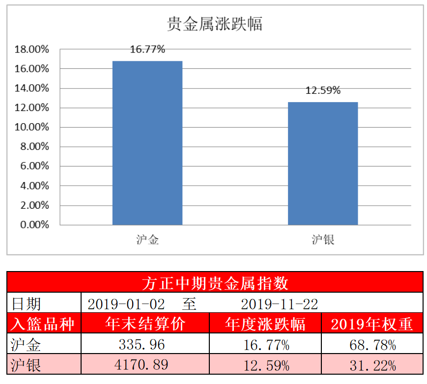 方正中期贵金属指数年末收于1329.36上涨15.57%,其中表现最好的是黄金上涨16.77%,表现相对较差的是白银上涨12.59% 。