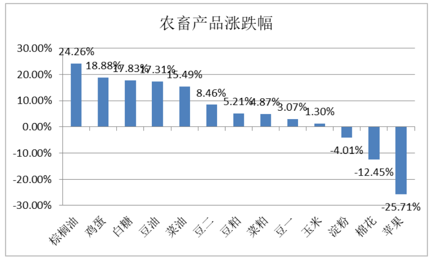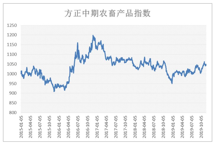 方正中期农畜产品指数年末收于1044.83上涨5.51%,其中表现最好的是棕榈油期货上涨24.26%,表现最差的是苹果期货下跌25.71%;