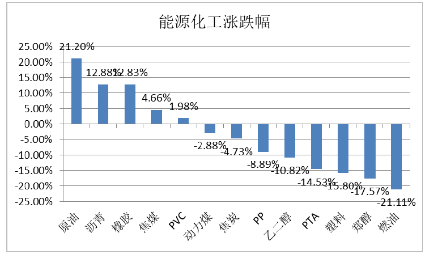 方正中期能源化工指数年末收于1172.11下跌3.46%,其中表现最好的是原油上涨21.20%,表现最差的是燃油下跌21.11%;