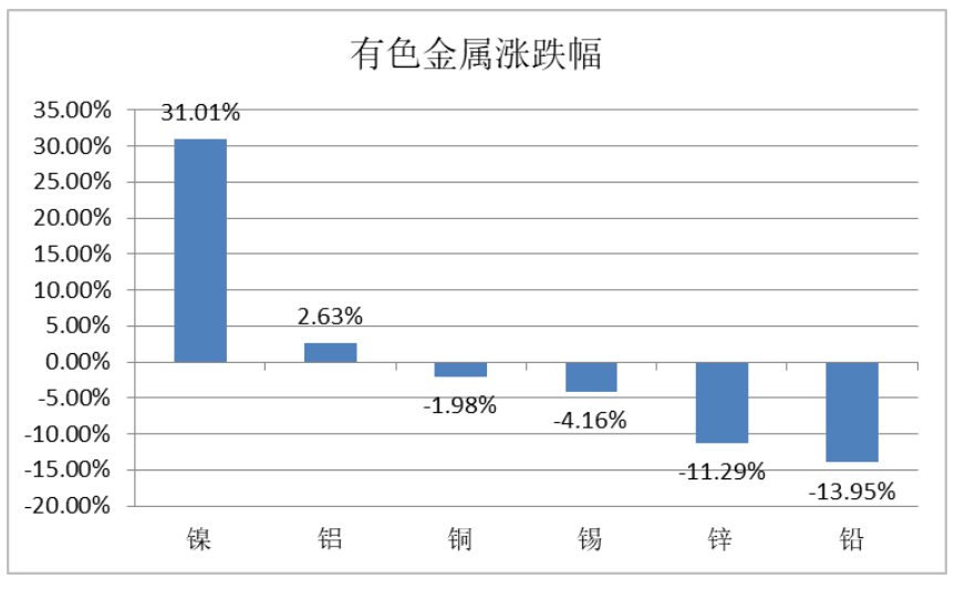 方正中期有色金属指数年末收于1196.45上涨0.61%,其中表现最好的是镍上涨31.01%,表现最差的是铅下跌13.95%;