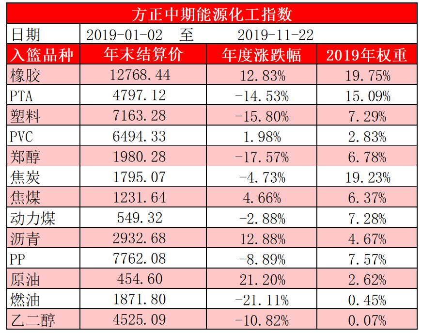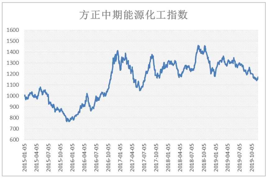 2019年方正中期能源化工指数连续下探,1月2日开于1214.16,11月22日收于1172.11下跌42.05,跌幅3.46%,指数均值为1262.06,高点1361.91,低点为1138.92。所包含的13个活跃品种大多下跌,其中有5个上涨,8个下跌。其中表现最好的是原油上涨21.20%,表现最差的是燃油下跌21.11%;