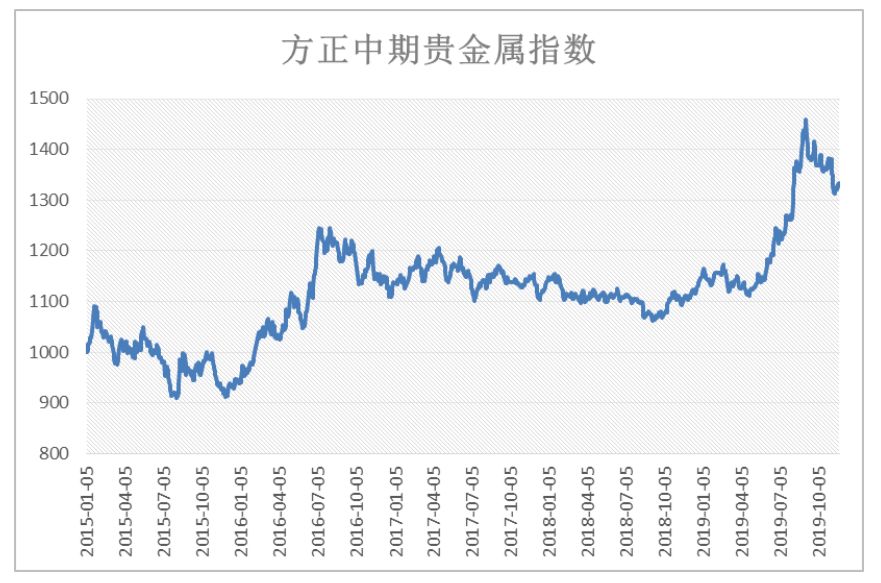 2019年方正中期贵金属指数先扬后抑,1月2日开于1150.23,11月22日收于1329.36上涨179.13,涨幅15.57%,指数均值为1236.78,高点为1458.08,低点为1110.90。其中表现最好的是黄金上涨16.77%,表现相对较差的是白银上涨12.59% 。