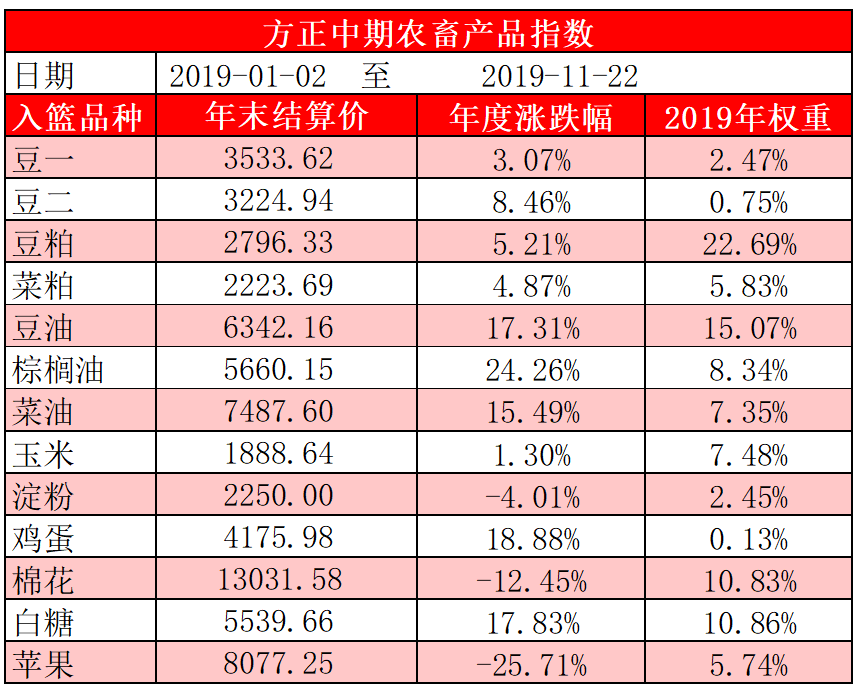 2019年方正中期农畜产品指数稳步上涨,1月2日开于990.22,11月22日收于1044.83上涨54.61,涨幅5.51%,指数均值为1015.76,高点为1061.98,低点为986.31 。所包含的13个活跃品种大多上涨,其中有10个品种上涨,3个品种下跌,其中表现最好的是棕榈油期货上涨24.26%,表现最差的是苹果期货下跌25.71%;