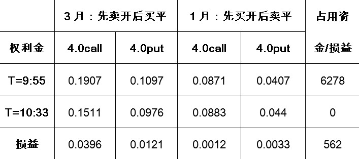 考虑近月流动性较佳,笔者选择卖出3月平值4.0跨式、同时买入1月平值4.0跨式,假设进场时机9∶55,并在10∶33离场,下表中前四列为对应时刻期权价格,核算得到交易1组可获得562元的收益,占用资金6278元,收益率高达8.9%。5个点的IV价差在半个小时内快速回归,市场纠正速度比较快,此等机会恐难重现。
