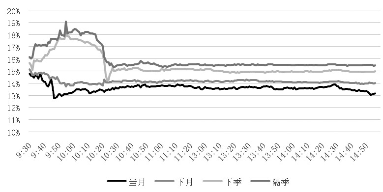 在上市首日开盘后不久,下季(3月)、隔季(6月)沪市300期权隐含波动率(IV)快速拉升,并在9点55分左右到达高点18%附近,随后快速回落到正常水平15%左右,同期当月、下月IV值在15%附近波动,甚至小有下跌,与3月、6月两个月份的IV值差距显著拉开。