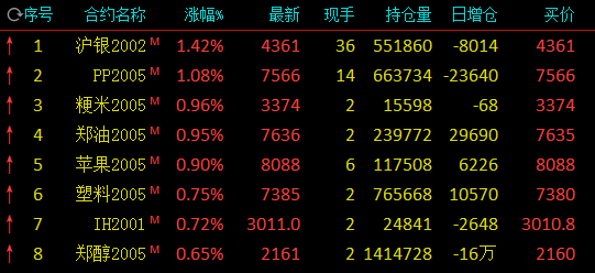 新浪财经讯 12月26日,国内期市早盘多品种飘红,但盘面鲜有亮点,交投清淡。沪银延续涨势涨逾1%;能化中,PP涨逾1%,塑料、甲醇涨近1%;农产品中油脂类走升,菜籽油涨近1%;黑色系弱势,焦煤、铁矿石跌近1%;有色中,沪铝跌近1%。