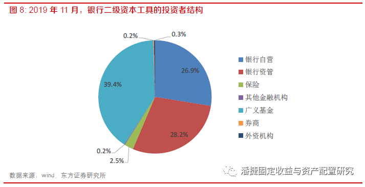 广义基金持有的银行永续债占比较低,在于对流动性的担忧。公募基金需要净值化管理,负债端稳定性较弱,因此,对流动性要求较高。而银行永续债由于期限较长,投资者较为集中,机构对流动性有所担忧。但随着未来银行永续债的流动性提升,广义基金持有银行的永续债的规模或有所提升。从银行二级资本工具的投资者结构来看,广义基金也是投资主力。
