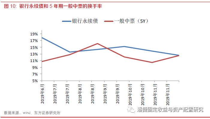 随着银行永续债市场存量规模提升,整体市场流动性也有提升。自2019年下半年以来,我们以“当月债券成交量/成交债券余额”作为换手率,通过计算,我们发现银行永续债的换手率与5年期的一般中票相差无几。