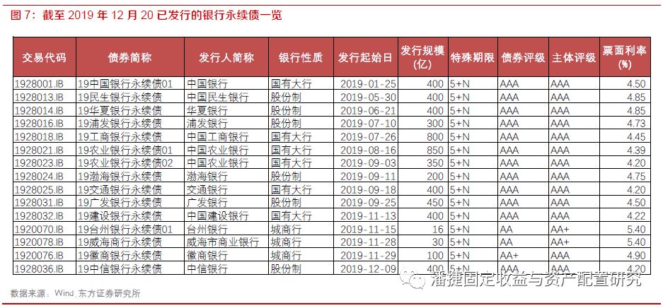 从发行主体来看,大银行发行节奏加快,中小银行逐步布局,主体评级以AAA为主。上半年仅发行3只银行永续债,绝大多数均集中于下半年发行,发行节奏明显加快。截至12月20日,国有五大银行均已发行了永续债,合计发行了3200亿左右;12家股份制银行中,已有6家股份制银行发行了永续债,国有大行的股份制行的主体评级均为AAA。此外,部分城商行也已获准发行了永续债,如徽商银行、威海银行、台州银行。