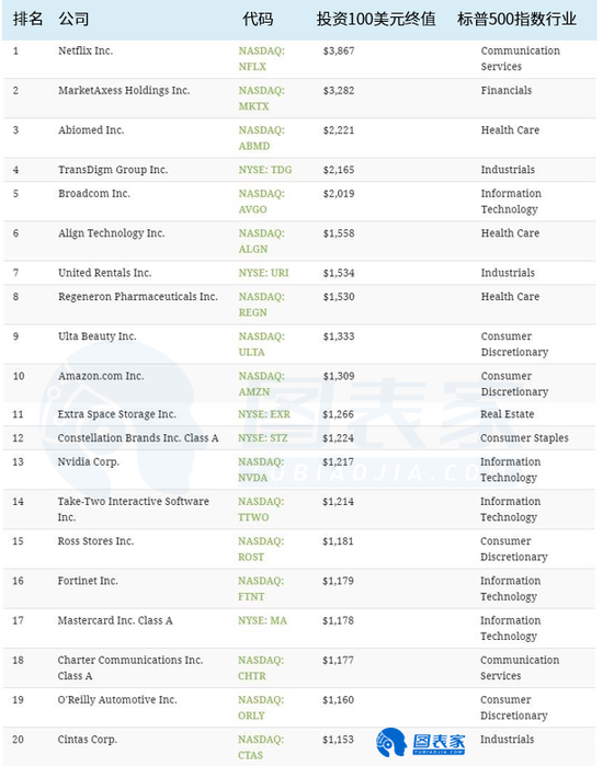 下图显示了过去10年表现最好的股票,并显示了100美元的初始投资在今天的价值。