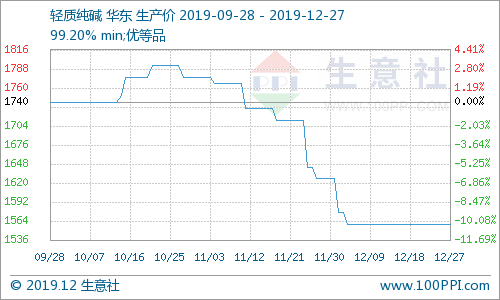据生意社监测数据显示,本周纯碱价格走势平稳。周内华东地区至周末市场均价为1560元/吨,较上周末价格持稳,较去年同比下跌26.53%。12月27日轻质纯碱商品指数为80.00,与昨日持平,较周期内最高点117.86点(2017-11-21)下降了32.12%,较2015年11月18日最低点63.15点上涨了26.68%。(注:周期指2011-09-01至今)