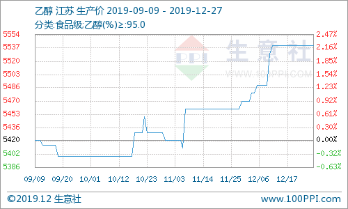 据生意社监测数据显示,截止12月27日,国内乙醇市场均价报5540元/吨,价格较上月同期环比上涨1.47%,价格较去年同期同比上涨3.88%。国内乙醇市场行情高位整理,部分地区行情坚挺。