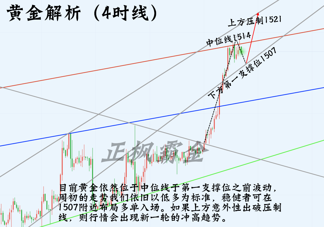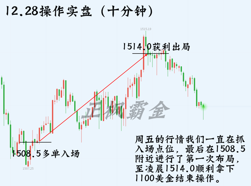 周五的交易日是以震荡结束了一天所有行情,我们在操作上早直接给出了低多为主的思路,但一直没有把握好进场的点位,直到午间在中位线回调支撑把握住了1508.5的切入点,直到凌晨1514才获利出局最后以1100美金的利润结束了一天的操作,在我们的日常交易中需要明白条条大路通罗马的道理,没有一层不变的思路与规则。