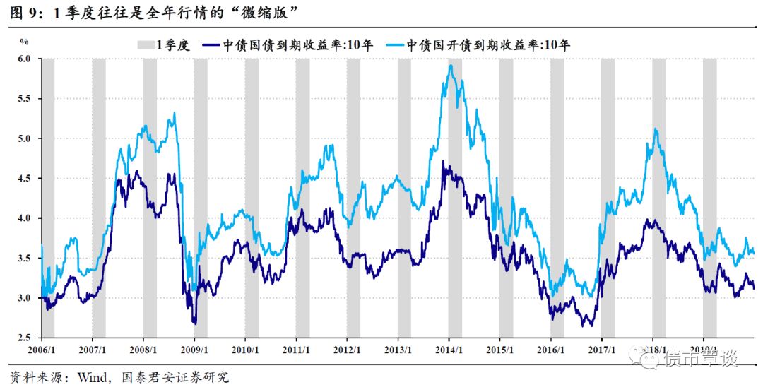历史规律显示一季度债市普遍安全。从历史上来看,一季度往往定调全年,行情方向节奏与全年基本一致,可谓全年行情的“微缩版”。这意味着,除了传统的配置力量之外,如果交易盘主流看法是2020年没有大的熊市风险,等待一季度调整后的机会,那么这种短空长多的预期本身也会成为一季度行情的稳定力量。