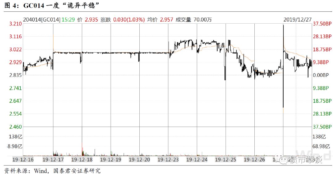 近期资金面宽松的原因是什么?直接原因是跨年资金的供给充足。此次资金面宽松的直接原因比较清楚:从12月18日开始,央行在公开市场投放了6000亿元的14天跨年资金,同时从12月17日开始,交易所也有机构以3%左右的价格“敞开”供应14D资金,一度造成了GC014的“诡异平稳”。