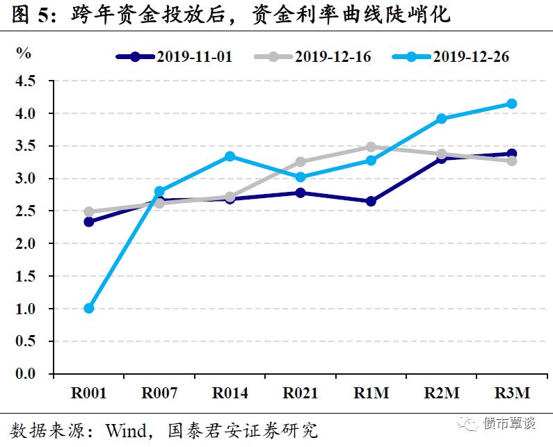 这说明在跨年之前,虽然央行进行一系列政策利率降息,但资金价格中枢下行有限。跨年资金大规供应后,隔夜利率“破1”很可能是跨年资金供给充分和资金需求从隔夜转向跨年的共振结果。