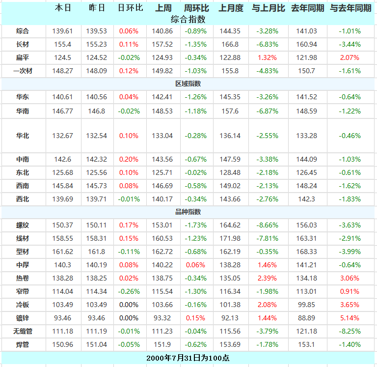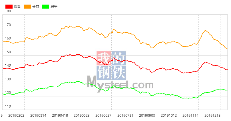 12月30日,国内钢材指数(Myspic)综合指数报139.61(绝对价格指数3949.7),较上一交易日上涨0.06%。其中,螺纹钢指数报150.37(绝对价格指数3800.9),较上一交易日上涨0.17%;热卷指数报138.28(绝对价格指数3877),较上一交易日上涨0.02%。