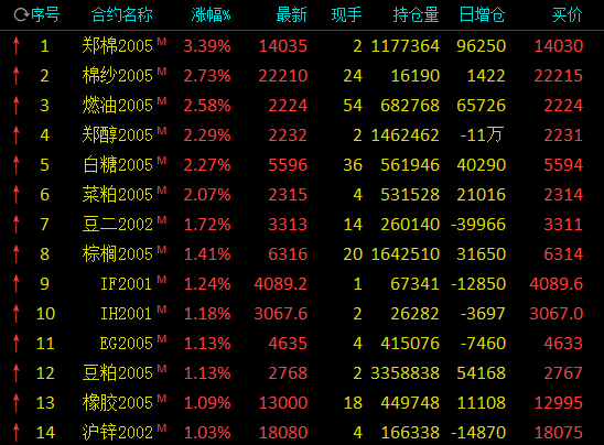 新浪财经讯 12月30日,国内期市早盘大面积上涨,农产品走势分化,棉花大涨逾3%,棉纱涨近3%,白糖、菜粕涨逾2%,豆二、棕榈油、豆粕涨逾1%,苹果大跌近4%,鸡蛋跌2%;能化板块走升,燃油、甲醇涨逾2%,橡胶涨逾1%;黑色系中,动力煤、焦煤涨近1%;有色涨跌互现,沪锌涨逾1%,沪锡跌逾1%。
