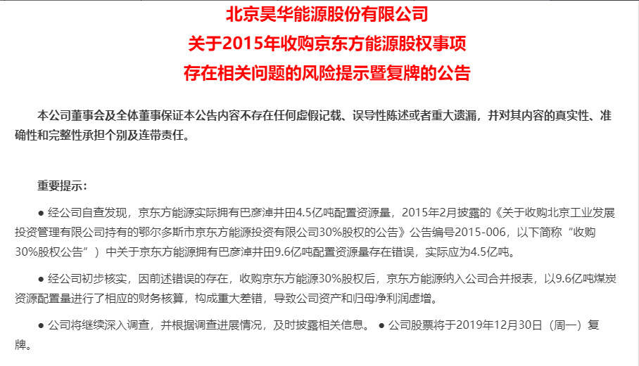 果不其然,12月27日晚,再有一家国企爆出大雷,那就是昊华能源。当晚,昊华能源发布公告称,经该公司自查发现,京东方能源实际拥有巴彦淖井田4.5亿吨配置资源量,2015年2月披露的《关于收购北京工业发展投资管理有限公司持有的鄂尔多斯市京东方能源投资有限公司30%股权的公告》公告编号2015-006,以下简称“收购30%股权公告”)中关于京东方能源拥有巴彦淖井田9.6亿吨配置资源量存在错误,实际应为4.5亿吨。经昊华能源初步核实,因前述错误的存在,收购京东方能源30%股权后,京东方能源纳入昊华能源合并报表,以9.6亿吨煤炭资源配置量进行了相应的财务核算,构成重大差错,导致昊华能源资产和归母净利润虚增。