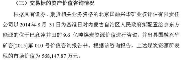 2015年2月10日昊华能源的公告称,根据具有证券、期货相关业务资格的北京国融兴华矿业权评估有限责任公司以2014年8月31日为基准日对内蒙古自治区人民政府拟配置给京东方能源的位于巴彦淖井田的9.6亿吨煤炭资源价值进行咨询,并出具国融兴华矿咨[2015]第010号价值咨询报告书。根据该咨询报告,上述煤炭资源所表现的市场价值为568147.87万元。