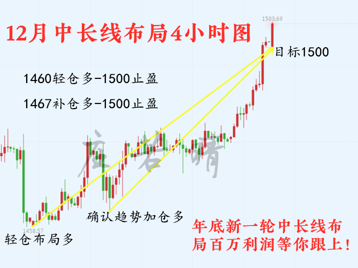 从10月初开始,黄金便开启多头之路,多头浪潮一浪接一浪,直接涨了近200点,这种强势行情难得一遇,总有朋友问我可以抄底了吗?从1360、1400至1420不停的犹豫,而机会总是在犹豫中错过!但对于中长线布局,很多朋友只看到利润很高,却找不到切入点,更不会合理利用自己的仓位和资金,或者中途就清仓只拿了部分利润,白瞎了这么好的行情!内行看门道,外行看热闹,如果没有专业的指路人,结局可能是血本无归!之前若晴就有讲过中线布局方法:浮盈加仓,移动止损!近期若晴又在着手新一轮的中线布局,以一单40-60点利润布局,如有想参与中长线布局的朋友,可以前来咨询若晴!