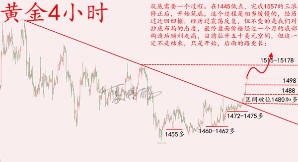 周线日线同时连阳收高,凸显多头强势,尤其是在突破1482一线后,真真的打破低位震荡筑底形态,进入多头放量走高阶段,我们期许已久的十二月单边强势行情最终到来,期许已久的三浪上升逐步展开,当然这仅仅是开始。参考第一浪1160到1437,第二浪1260都1557,那么三浪一定不是最差的一浪,往往是最有价值的一浪,所以抄底多单未来可期,耐心持有。