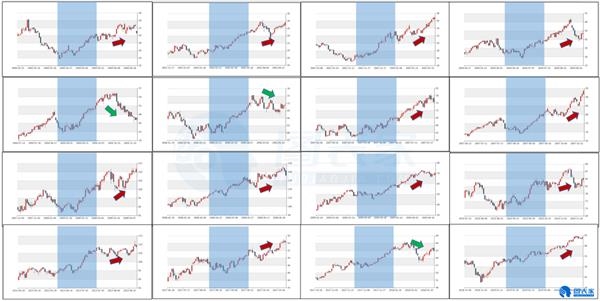 Data Talks在过去的20年中寻找相似的价格走势,发现与最近30个交易日价格走势相关系数在0.85以上的近16个时间段(蓝色区块内)中,未来的30个交易日中价格上涨13次,下跌3次,价格呈现明显的上涨趋势。
